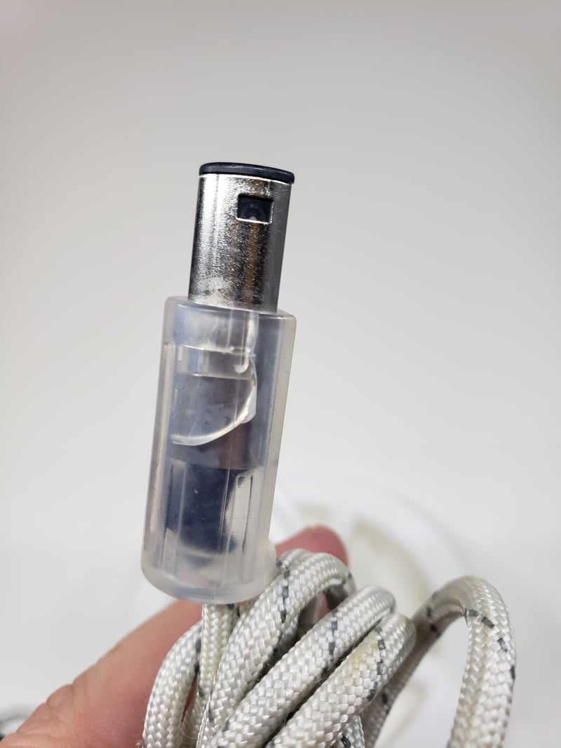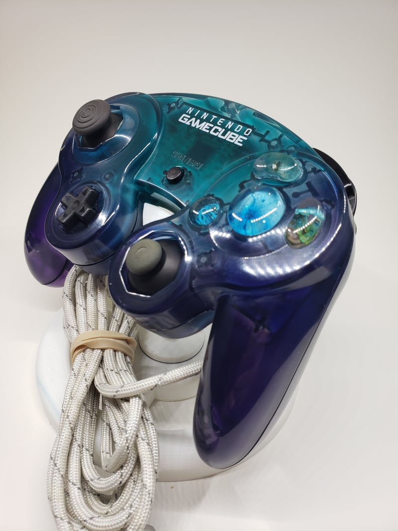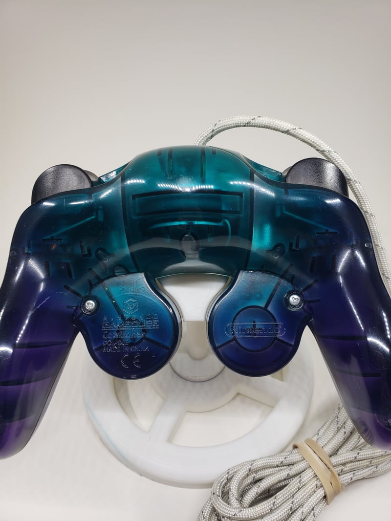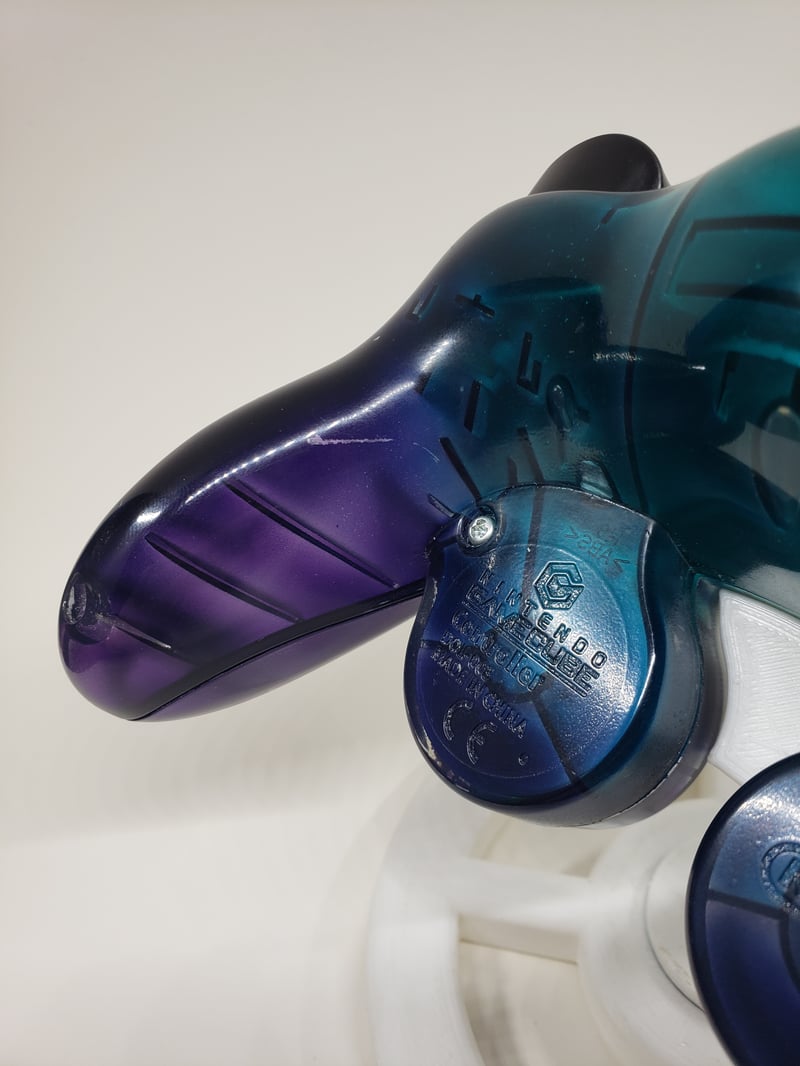Slight discoloration around control stick from buffing(pic2), small scratch on inside of back shell(pic4), and crack on clear plug(pic5). As such this product will be heavily discounted.